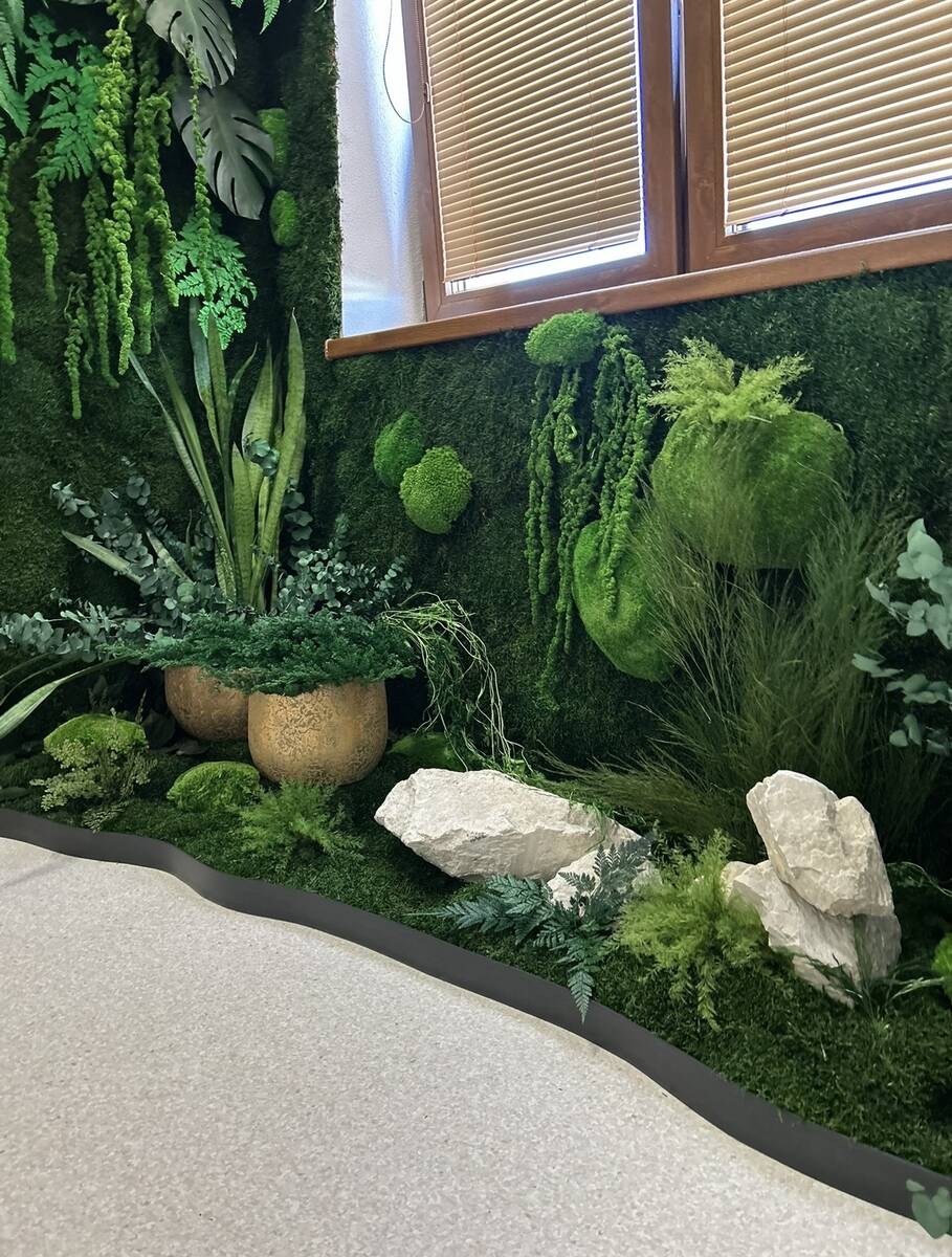 Spodná časť realizácie je doplnená o machový ostrov s prírodným kameňom a jemnými rastlinami, ktorý vytvára prirodzený prechod medzi stenou a podlahou